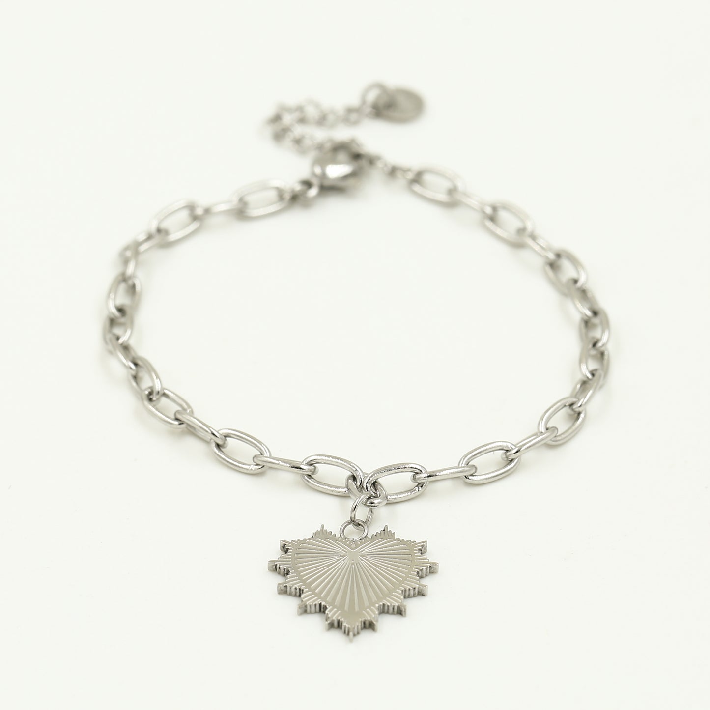 Armbandje mi corazon zilver is een armband met grove schakel en een groot hart. Goed te dragen door mensen met een groot hart, maar ook met een klein hartje combineert dit prima. Het externe hart is in ieder geval van hoogwaardige kwaliteit stainless steel (rvs) en verkleurt niet. Met de afmeting van zo'n 1,5 centimeter is het een heuse eyecatcher. De ketting is 16 centimeter met een verlengkettinkje van nog eens 3 centimeter.