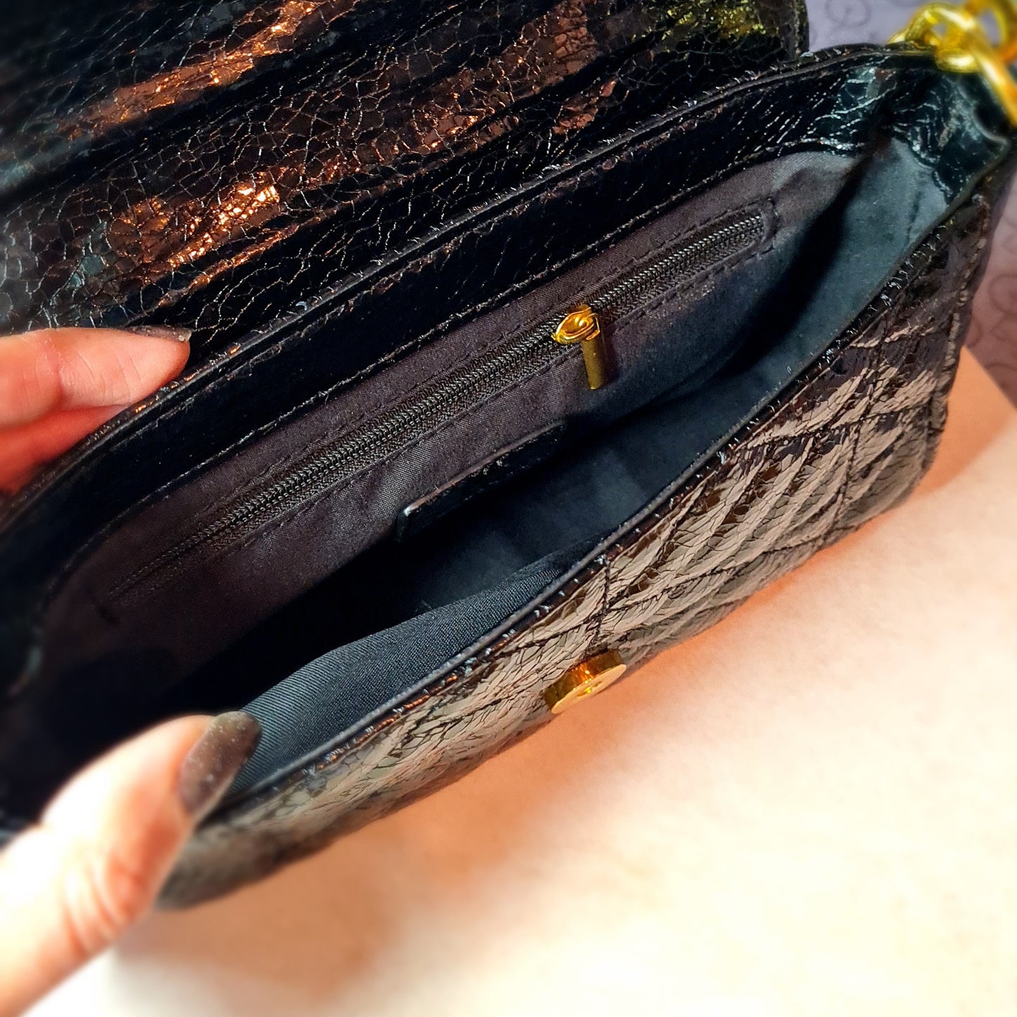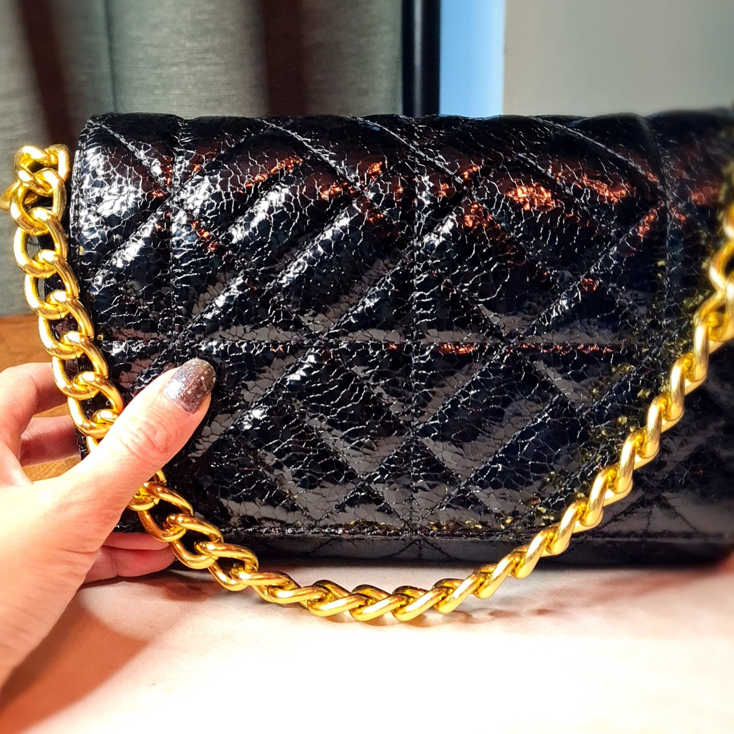 Wauw! Check deze prachtige zwarte metallic tas versierd met stiksels. De tas heeft een gouden ketting als tassen strap met grote schakels, wat het een luxe uitstraling geeft. Het materiaal van de tas is PU leer en de ketting is gemaakt van metaal. Daarbij pas er ook genoeg in het tasje voor een middagje shoppen of een avondje uit, want de afmeting is 21 cm x 16 cm x 6 cm. Niet te groot, niet te klein, maar precies goed!