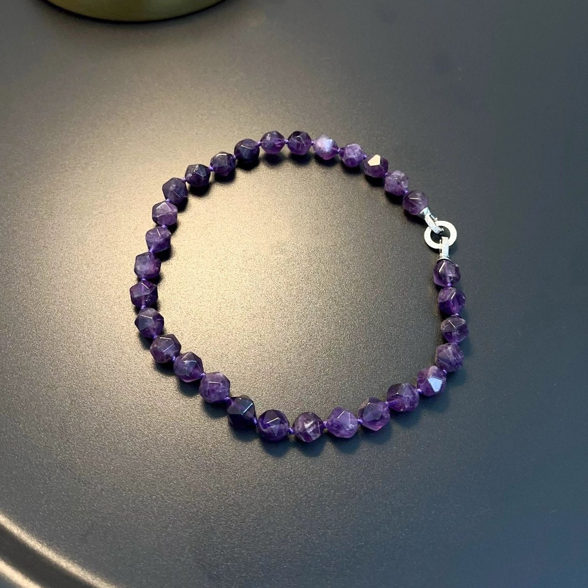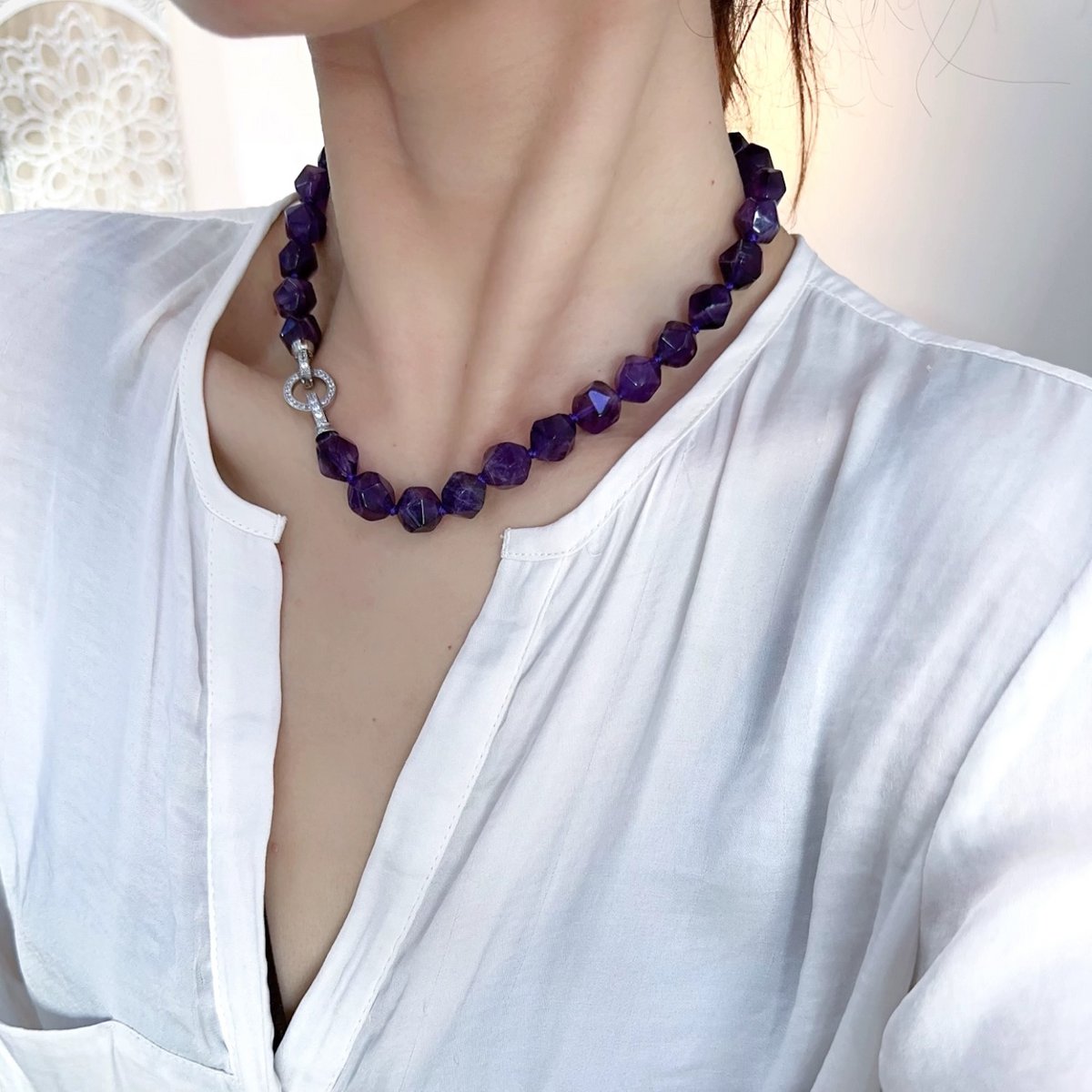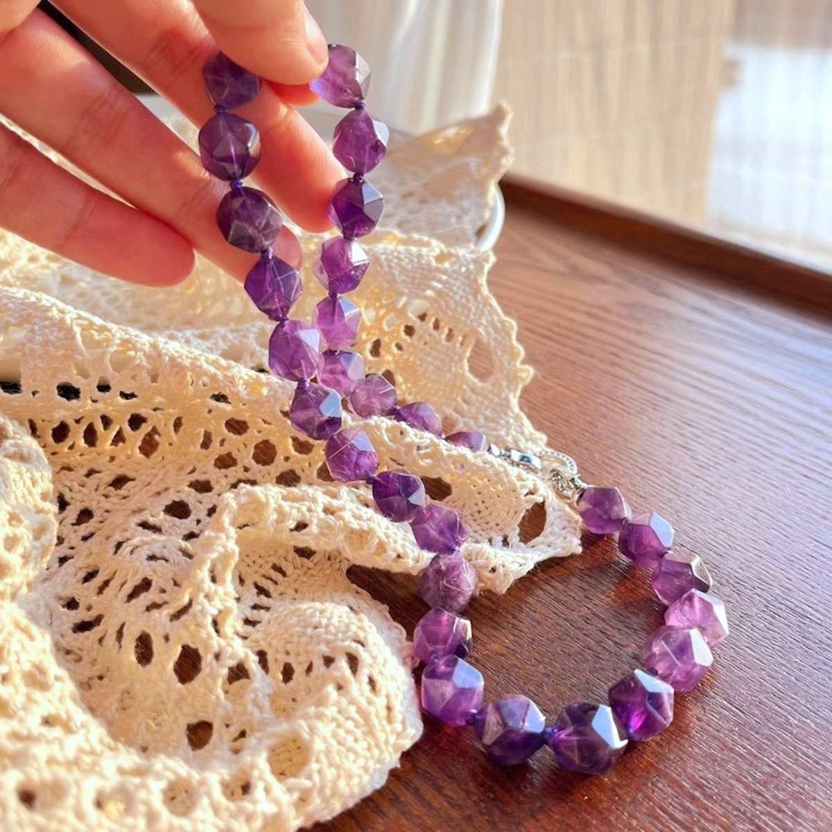 Elke kraal is zorgvuldig vervaardigd uit echte amethistkristalstenen, waardoor hun natuurlijke schoonheid en unieke kwaliteiten worden benadrukt. Het gefacetteerde ontwerp voegt diepte en dimensie toe aan de ketting, vangt het licht op en creëert een betoverende schittering bij elke beweging.
