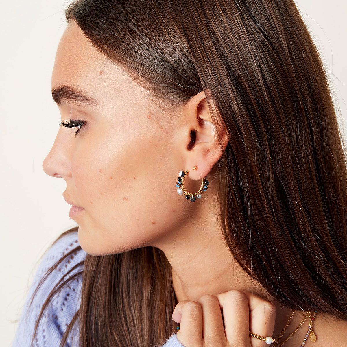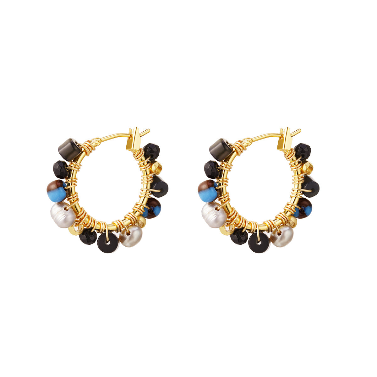 We kunnen alles-in-een hebben met deze oorbellen, een klein feestje waar parels en glaskralen elkaar beleefd aanvullen. Het materiaal van de oorbellen is koper met daarover een fijn goudlaagje.