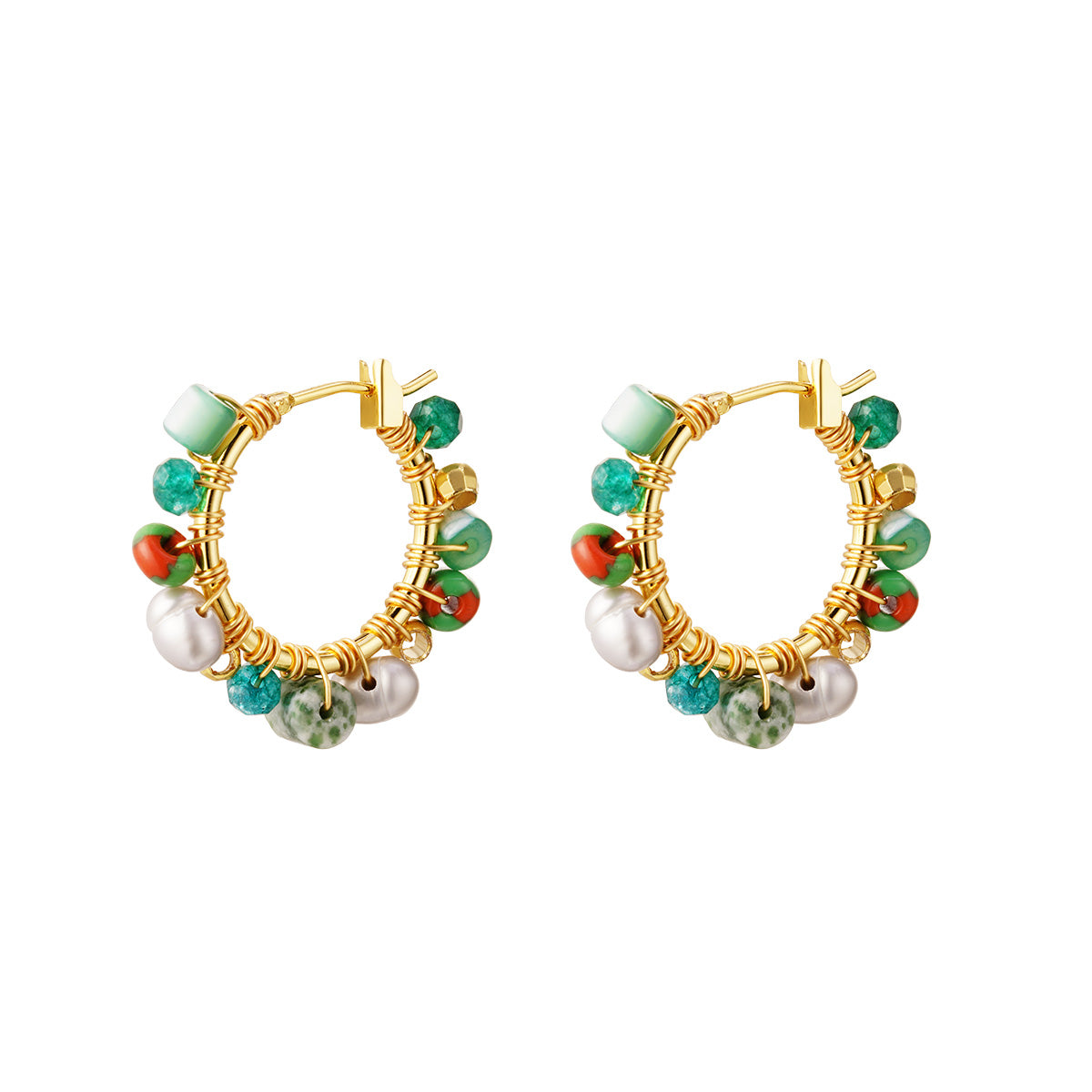 We kunnen alles-in-een hebben met deze oorbellen, een klein feestje waar parels en glaskralen elkaar beleefd aanvullen. Het materiaal van de oorbellen is koper met daarover een fijn goudlaagje.