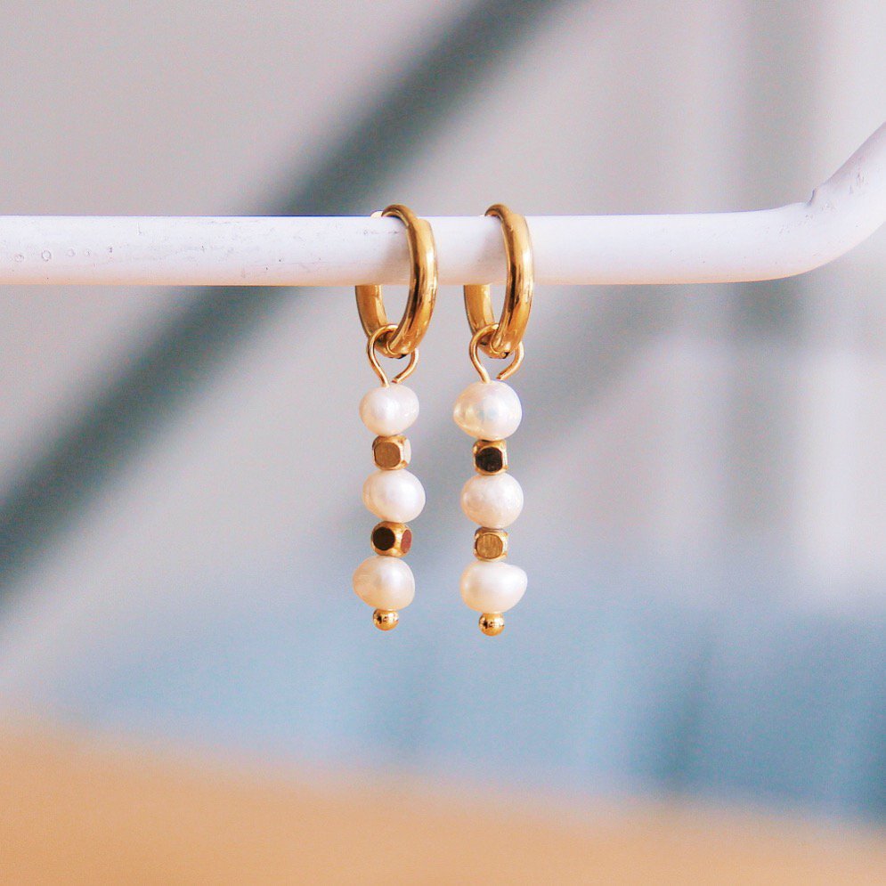 Edelstalen oorringen met 3 zoetwaterparels en blokjes - goud