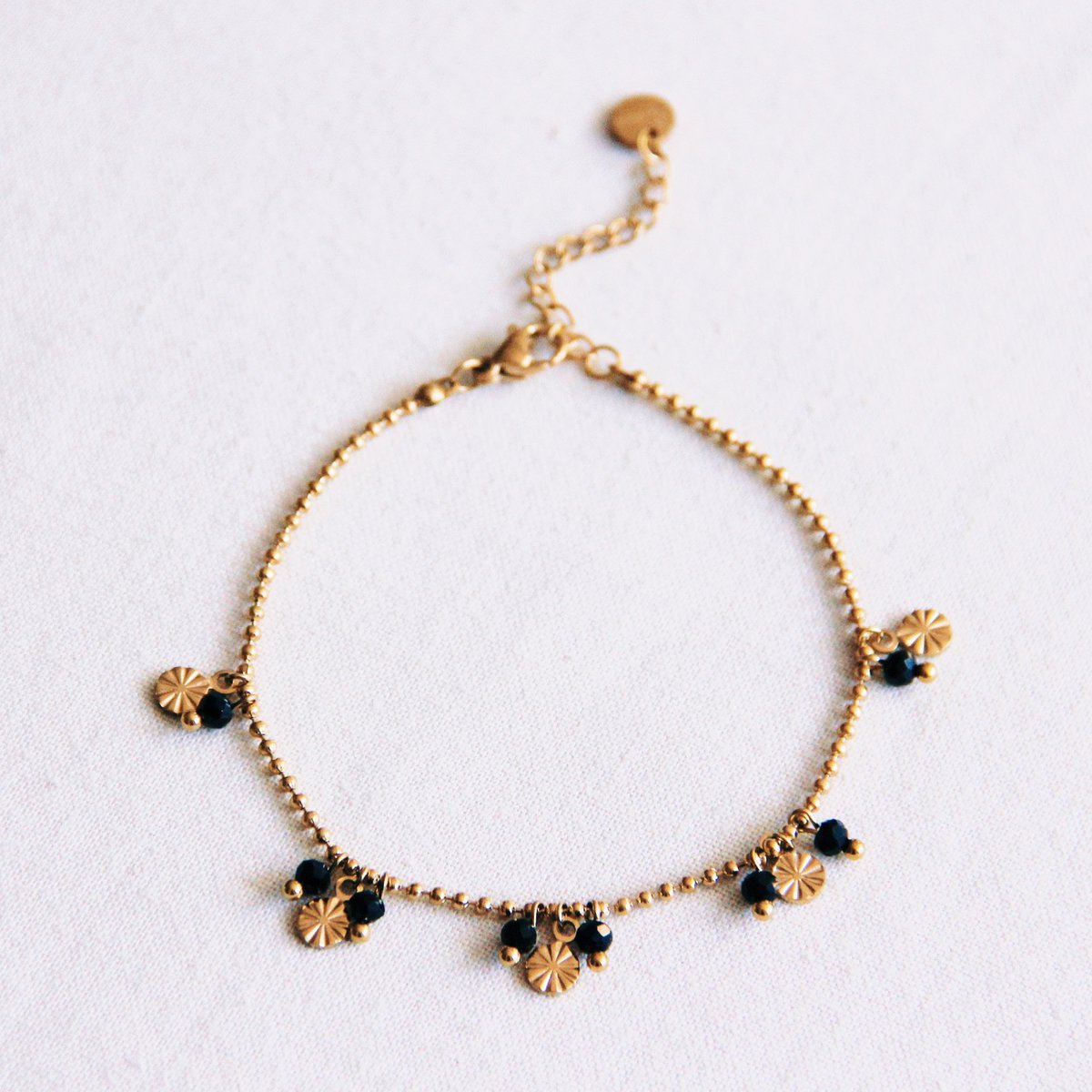 Fijne ball chain armband met sierlijke muntjes en facetten - zwart