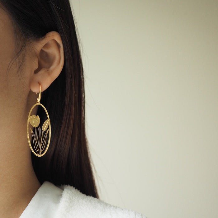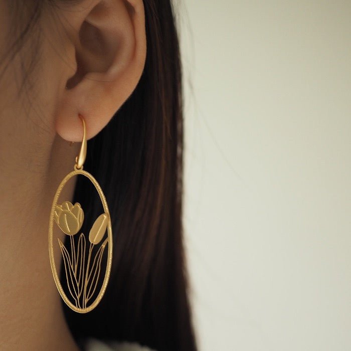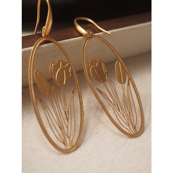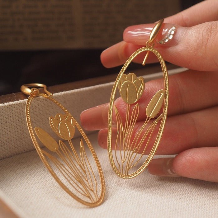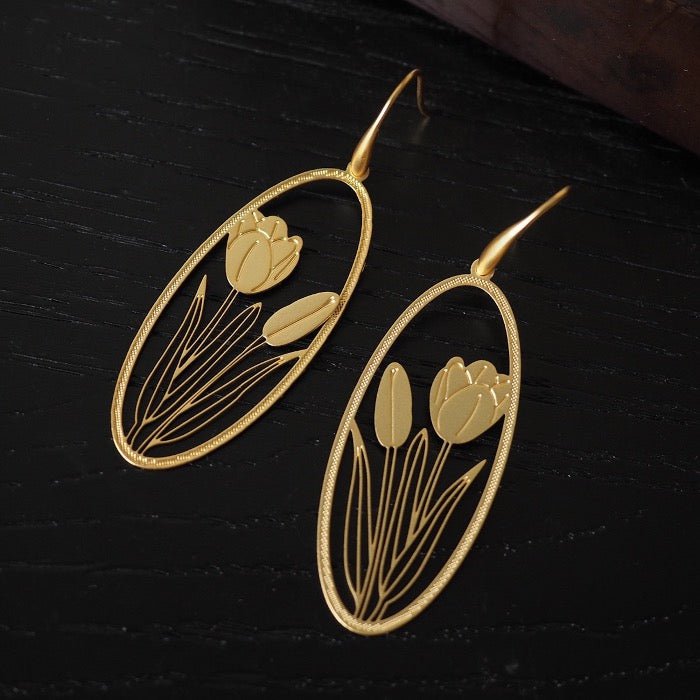 Deze statement-oorbellen stralen tijdloze elegantie uit met hun filigrane ontwerp en vintage charme. Deze gouden tulpenbloemoorbellen hebben ingewikkelde holle frames in de vorm van delicate tulpen, waardoor een boeiende en stevige look ontstaat die een vleugje weelde aan elke outfit toevoegt. Deze oorbellen zijn gemaakt van messing, dat verguld is om ze een luxe, blijvende glans. De afmetingen van deze oversized oorbellen zijn 6x2 cm, waardoor ze een opvallend en opvallend accessoire zijn dat overal de aandacht zal trekken.