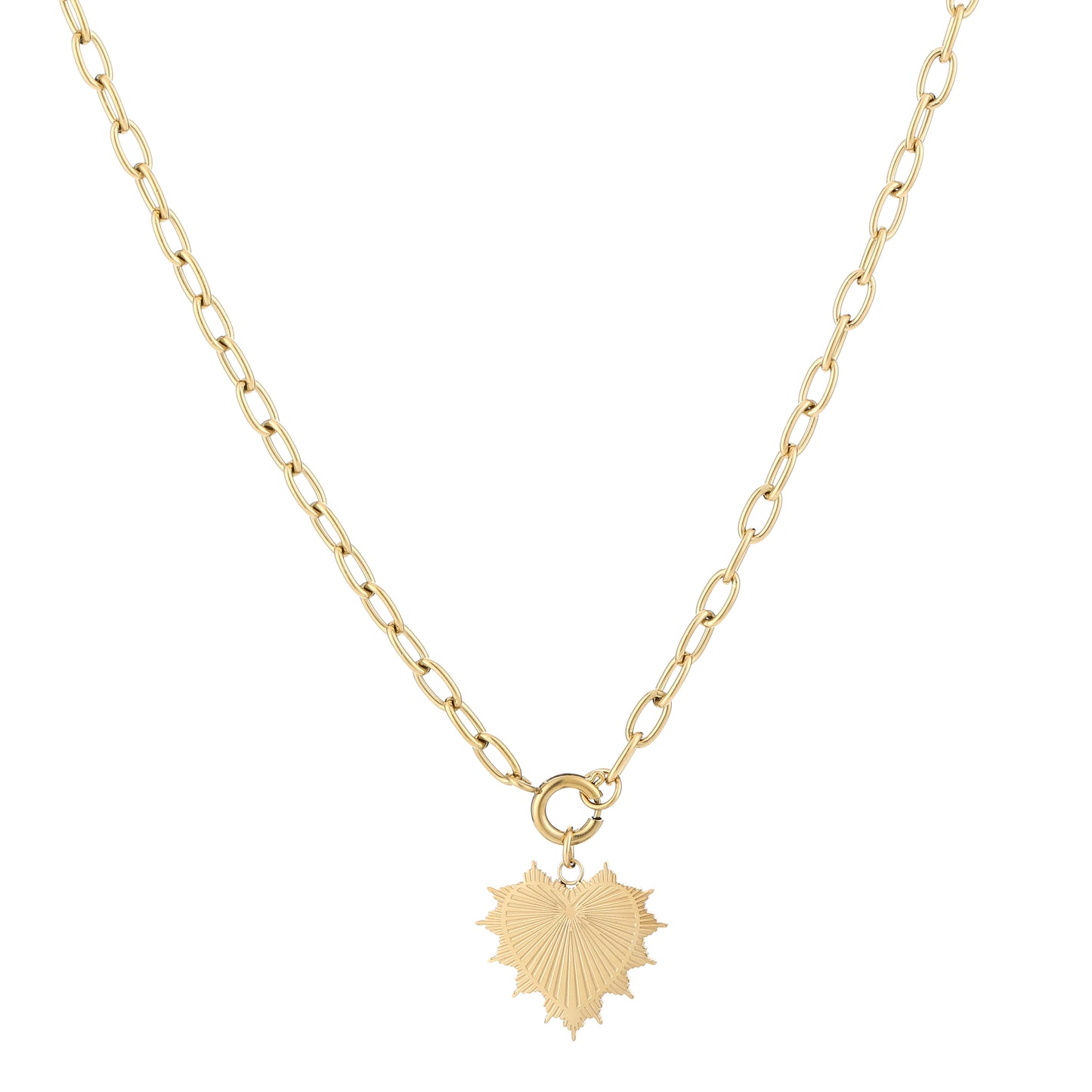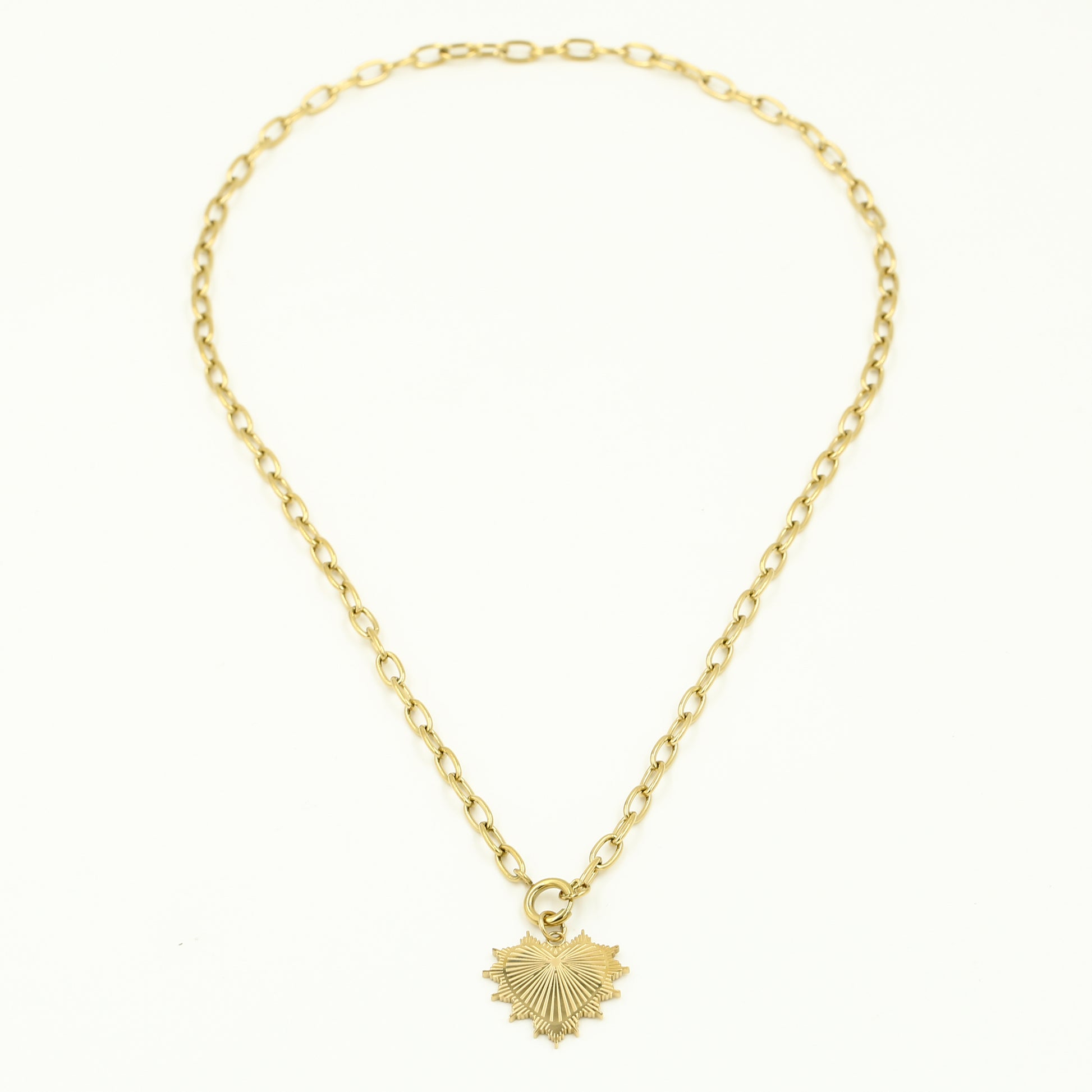 Halsketting met grove schakel en een groot hart. Goed te dragen door mensen met een groot hart, maar ook met een klein hartje combineert dit prima. Het externe hart is in ieder geval van hoogwaardige kwaliteit stainless steel (rvs) en verkleurt niet. Met de afmeting van zo'n 2 centimeter is het een heuse eyecatcher. De ketting is 40 centimeter met een verlengkettinkje van nog eens 5 centimeter.