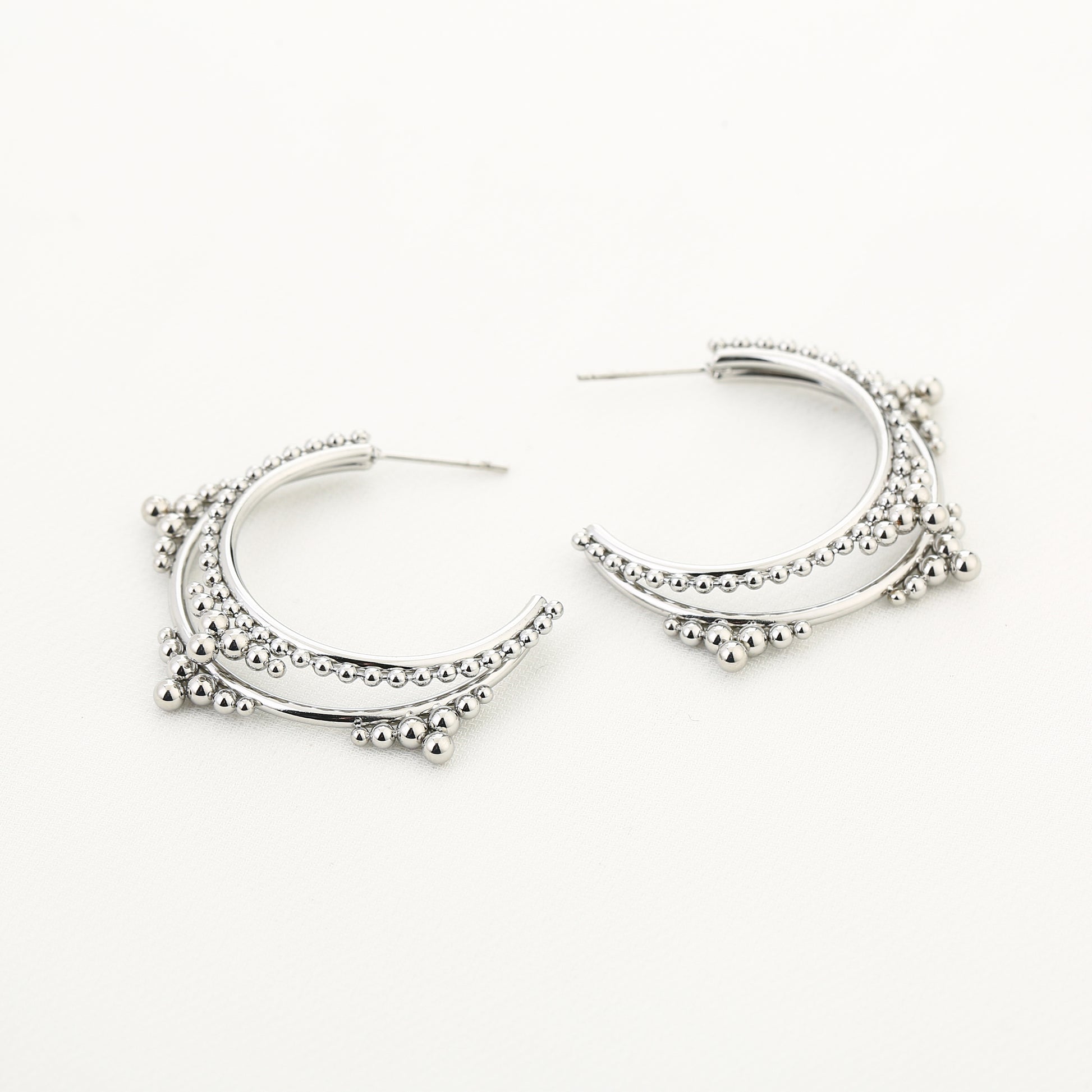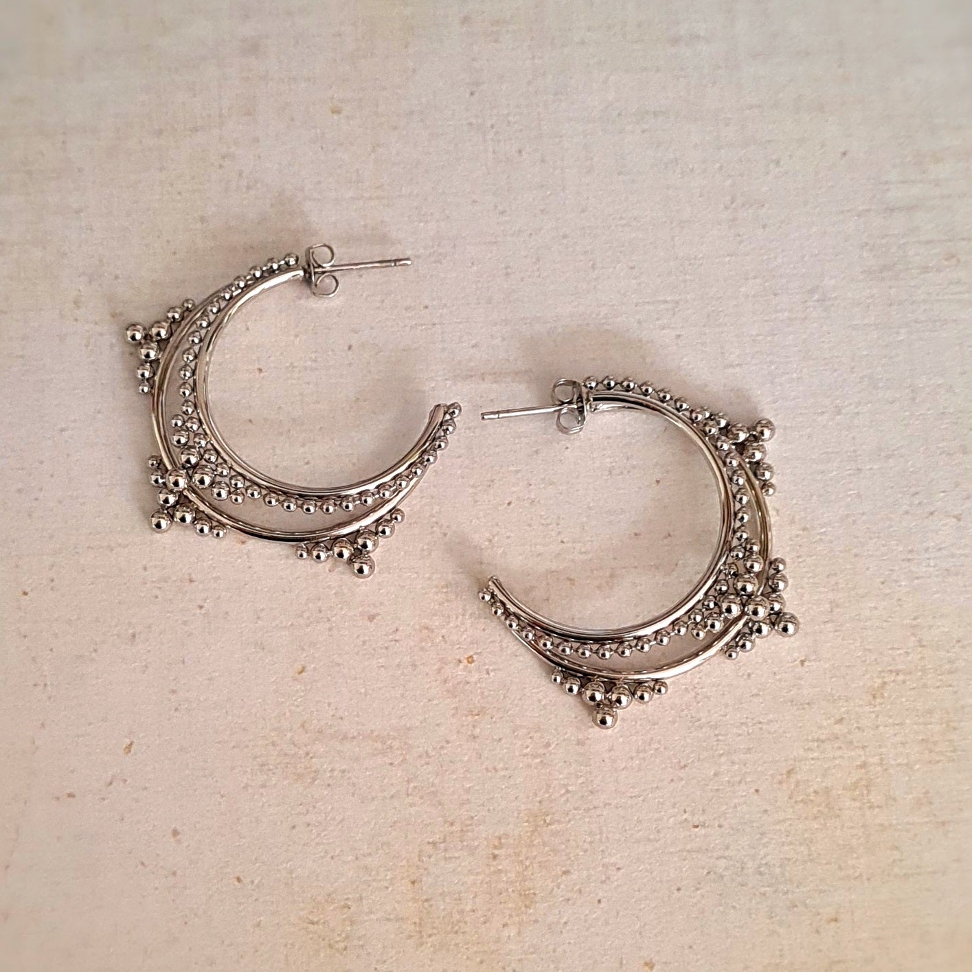 Indian silver oorbellen zijn mooie stainless steel (roestvrij staal) oorbellen met een Oosterse stijl. Door het materiaalgebruik kunnen deze oorbellen wel tegen een stootje -of een spatje water, ze verkleuren niet. Wees wel voorzichtig met zwemmen in chloorwater zoals in een zwembad, zelfs het stevigste staaltje kan hierdoor wat doffer worden. Deze oorbellen hebben van het uiterste bolletje tot het andere uiterste bolletje een afmeting van 3,5 centimeter. Ze hebben de looks van oorringen, maar het zijn oorstekers die aan de achterkant met een knopje vastgezet worden, dit zie je ook op de foto.