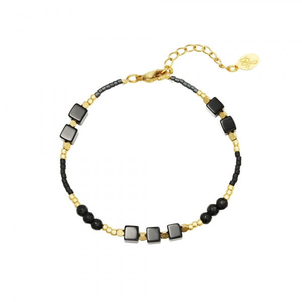Kralenarmband met natuursteenkralen en Stainless steel kralen. Mooi om enkel te dragen of in combinatie met andere armbandjes. Afmeting is 16 centimeter met verlengkettinkje van 3 centimeter. Het armbandje weegt 2,8 gram. De vierkante kralen zijn van natuursteen en zijn niet altijd 100% zwart, dit geeft een speels effect en het ziet daardoor ook wat leuker uit. Het is een fijn (dun) armbandje wat gemakkelijk gecombineerd kan worden met andere sieraden.
