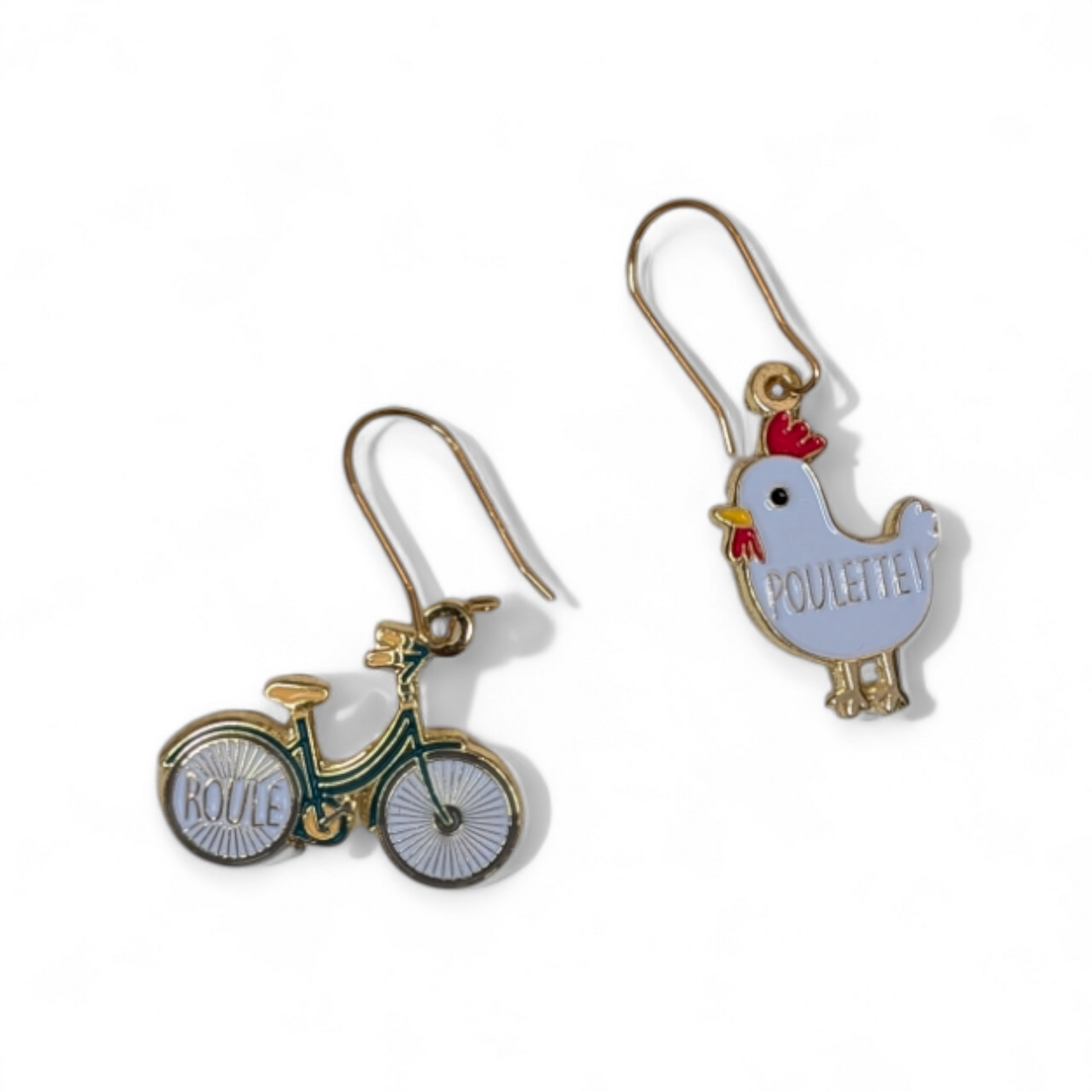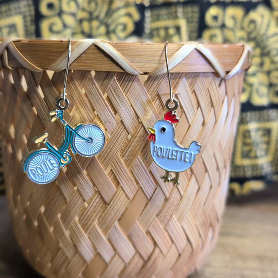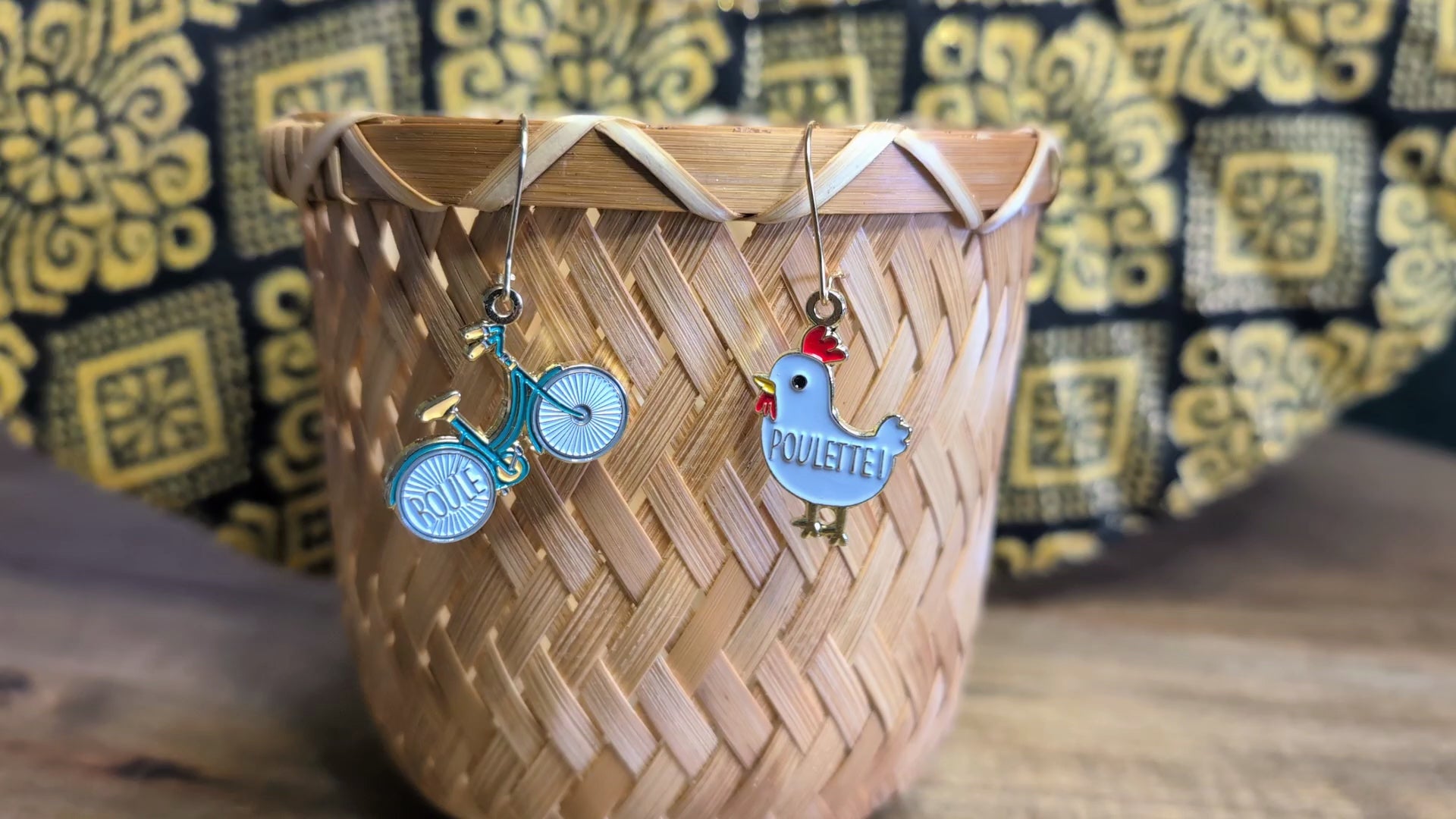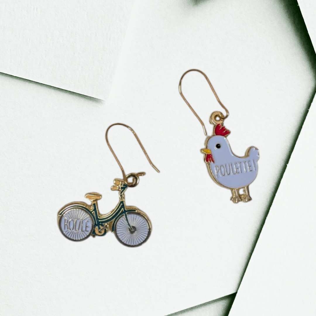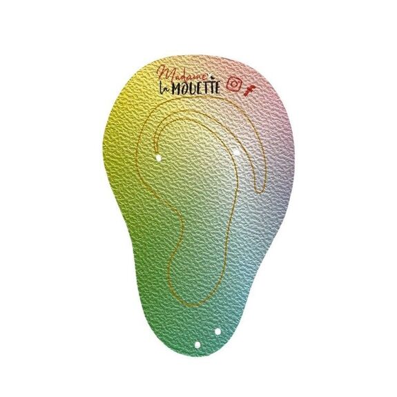 Illustratie van Madame la Mouette, oorbellen gepresenteerd op een mooi aquarelkarton (gemaakt van gerecycled papier) dat een oor voorstelt in de kleuren van de regenboog.