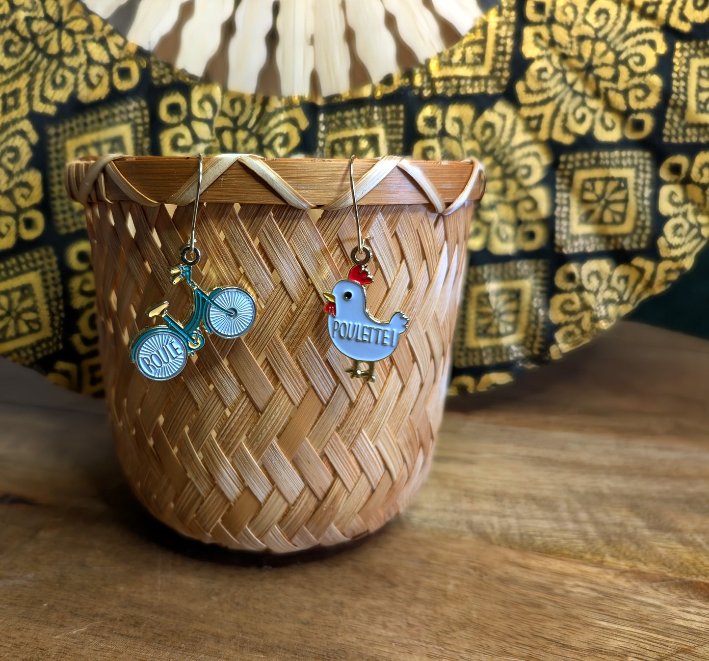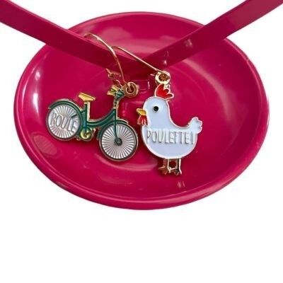 Kwaliteitsgouden oorbellen met 2D-reliëf, gekleurde lakken, gebruik van hoog- en laagreliëftechniek, roestvrijstalen steunen