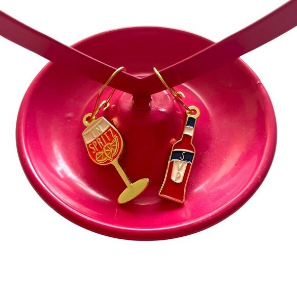 Kwaliteitsgouden oorbellen met 2D-reliëf, gekleurde lakken, gebruik van hoog- en laagreliëftechniek, roestvrijstalen steunen
