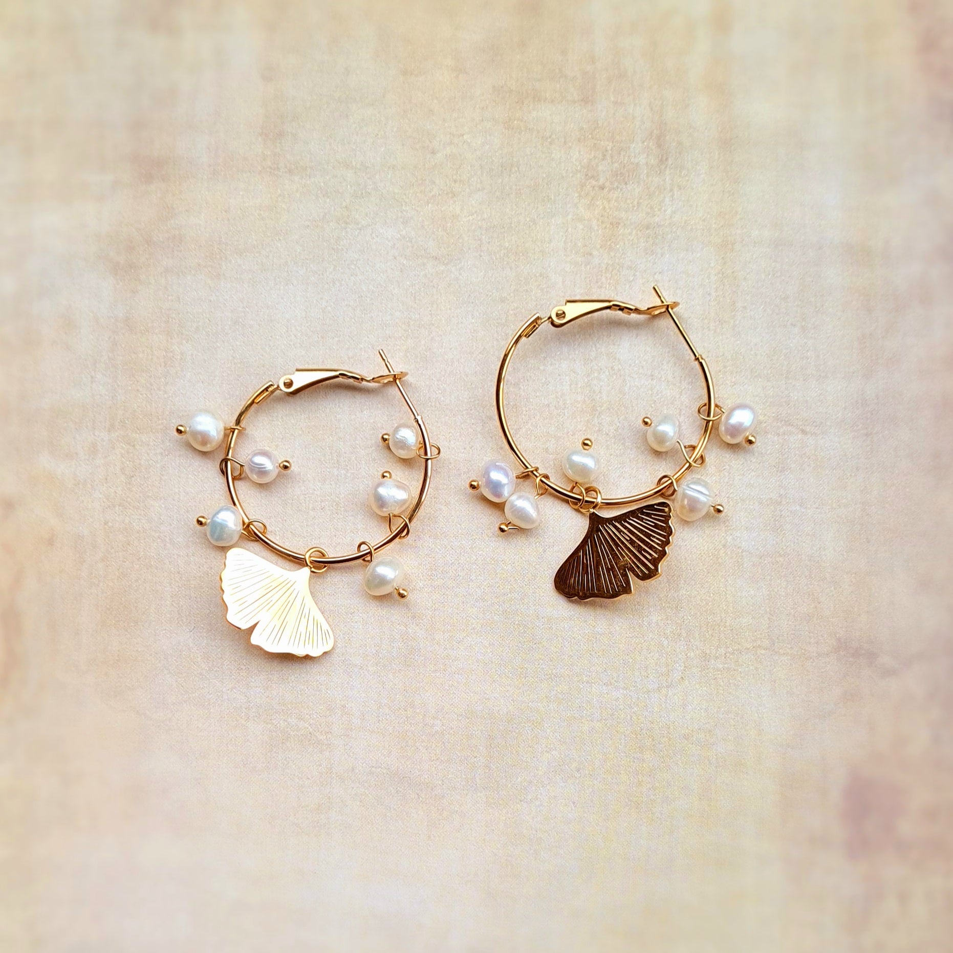Deze prachtige Stainless steel oorbellen met Ginko blad en parels hebben een bescheiden, doch luxe uitstraling. Het zijn echte parels en de hoge kwaliteit roestvrij staal geven het een realistische goudkleur.