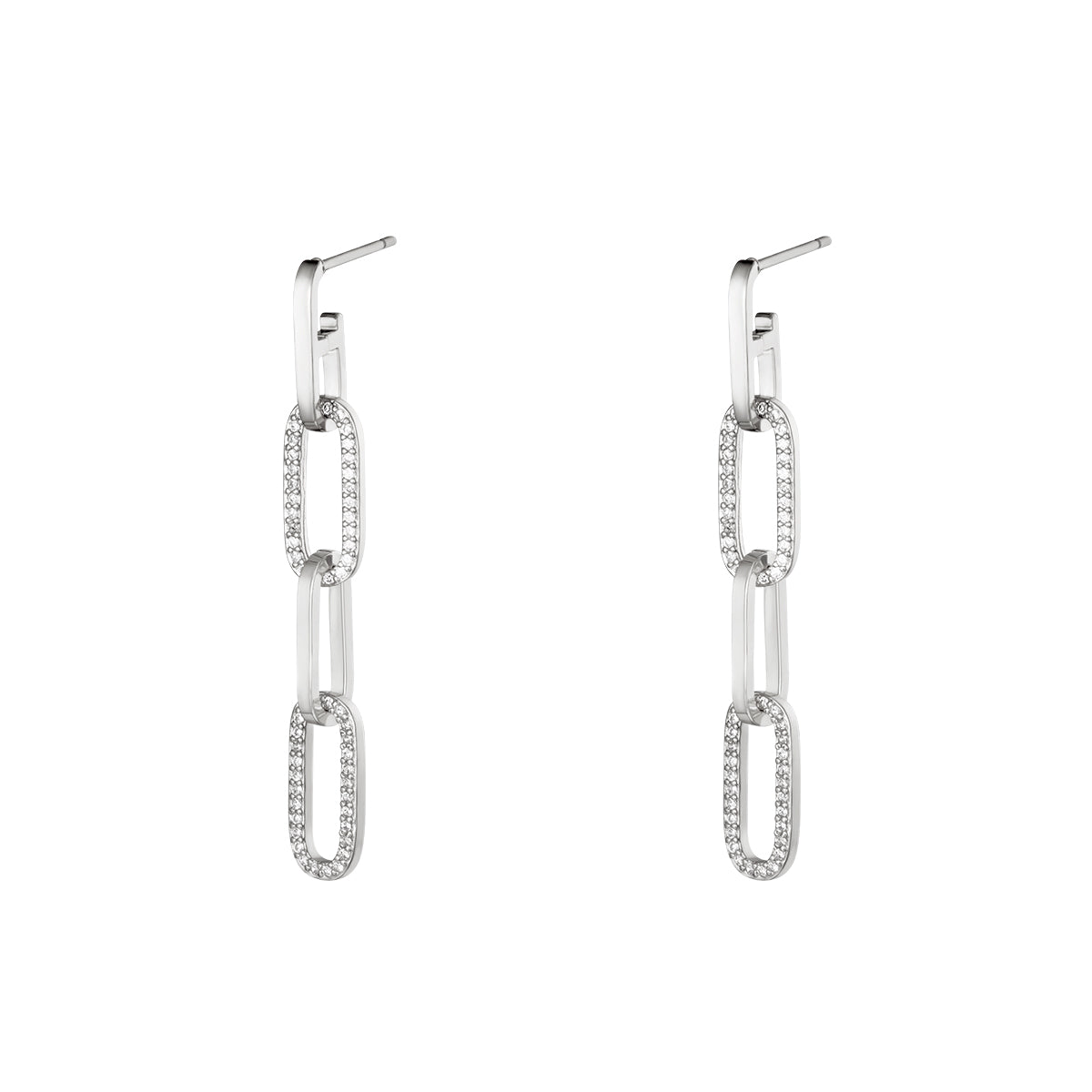 Oorbellen glamourous silver zijn stijlvolle lange oorbellen met losse in elkaar hangende schakels. Materiaal is goldplated koper met zirkonia strass steentjes. Afmeting is 4,7 cm lengte en breedte is 0,7 cm. De oorbellen wegen 4,1 gram.