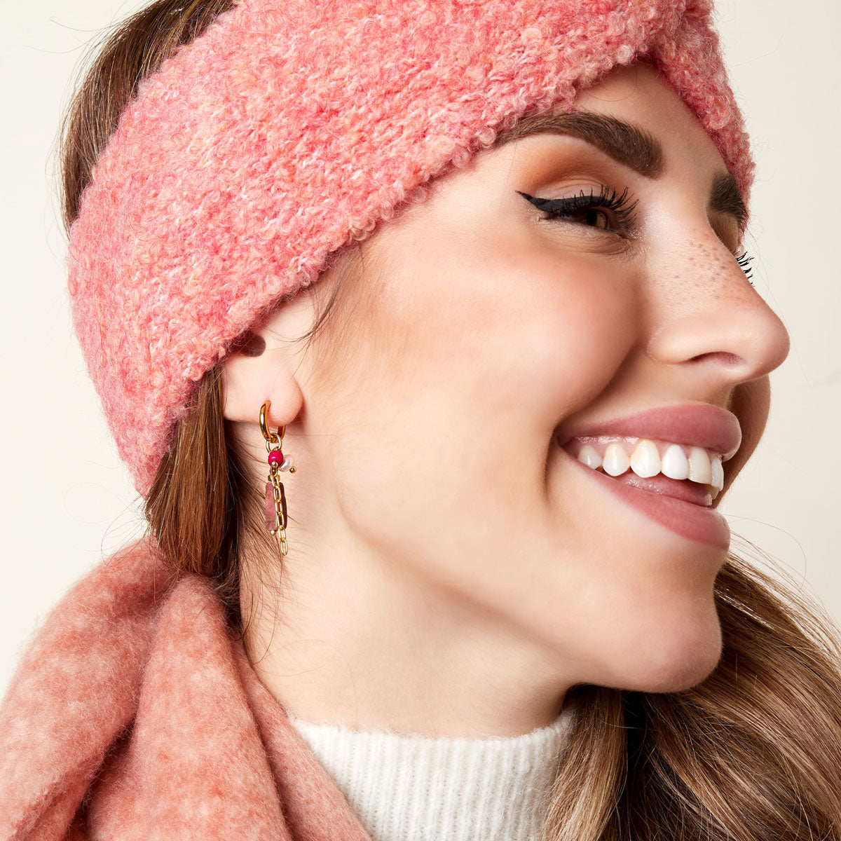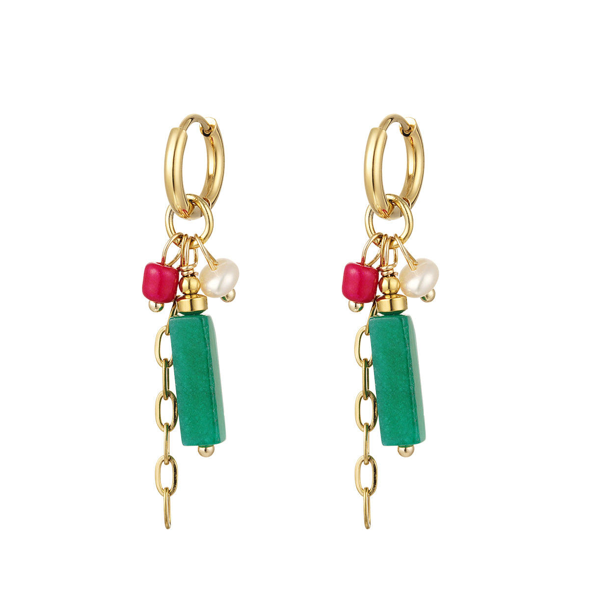 Speelse oorbellen met donker groene rechthoekige steen en kraaltjes en een bungelend kettinkje. De oorbellen zijn gemaakt van stainless steel, hematiet, glaskralen, parels en steentjes. De oorbellen hebben een gewicht van 4,2 gram en zijn 4,5 cm lang en perfect te combineren met meerdere gouden oorbellen.