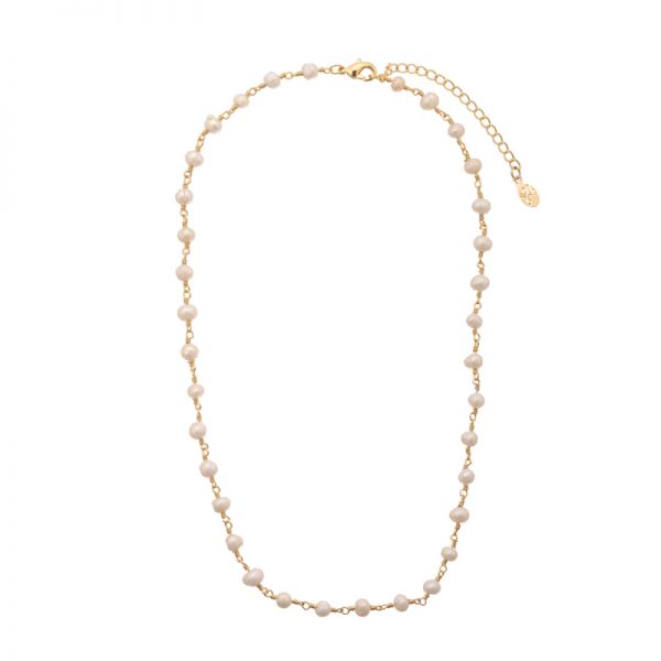 Deze prachtige ketting heeft een subtiele schakelketting als basis. Rondom de ketting zitten prachtige kleine parels waardoor de ketting een mooi elegante uitstraling heeft. Door de gouden schakels tussen de parels door is de parelketting wel wat stoerder dan een parlelketting vol met parels. De parels zijn zoetwaterparels en de ketting is gemaakt van koper en is gold plated, dat houdt in dat er een heel dun laagje goud over zit. Zorg dat de ketting droogt blijft zodat je er lang van kunt blijven genieten. Afmeting: 35cm met 5cm verlengkettinkje, gewicht is 4,8 gram.