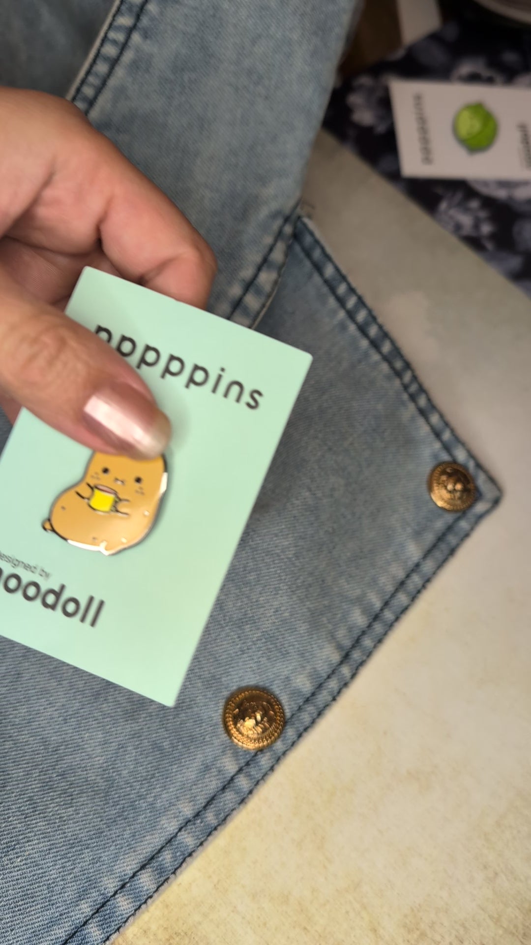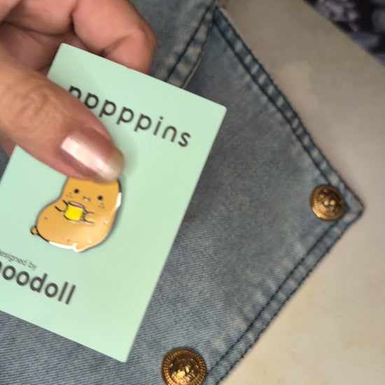 Deze schattige beige aardappel pin houdt een klein geel mokje vast - zien ze er niet ontspannen uit? Het is het perfecte accessoire.