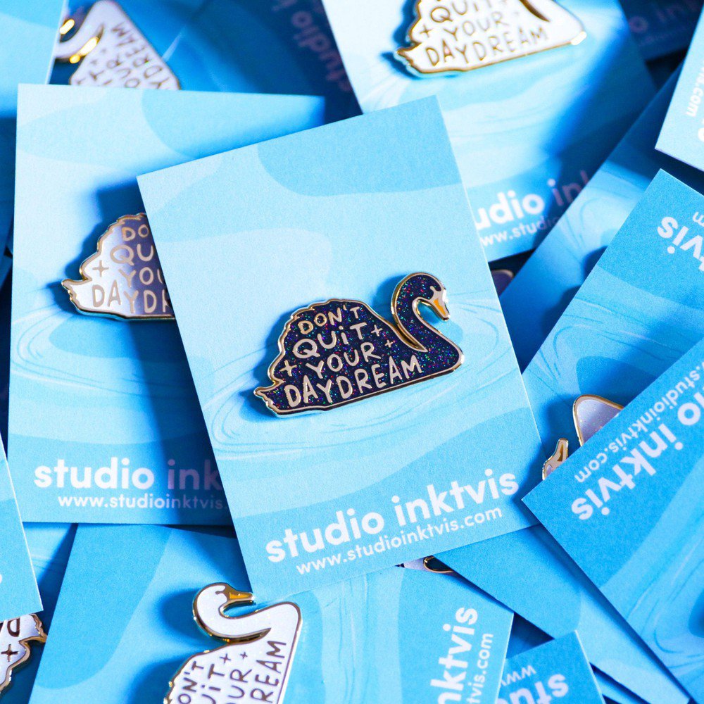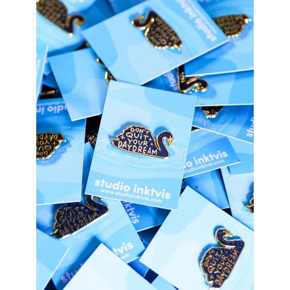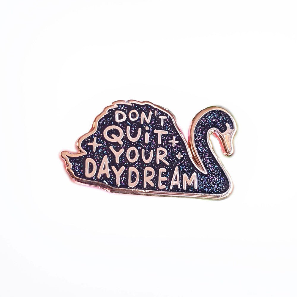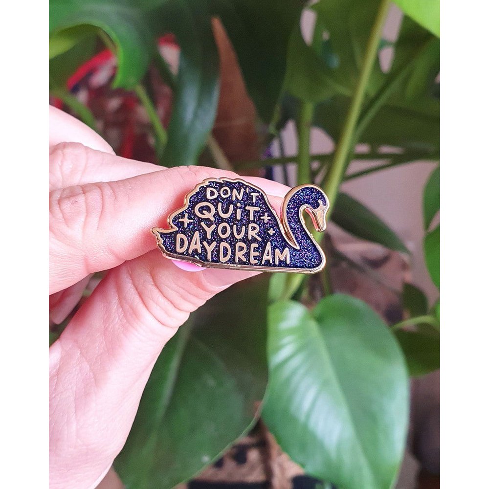 Pin Don't quit your daydream zwaan is een super, geweldig trendy pin met glitter voor elke zwaan lover. Deze pin is een super, geweldig trendy accessoire. Deze pin zal daarom hip staan op elk jasje, pet of tas. Tevens leuk om op een rugzak te dragen en deze te versieren.