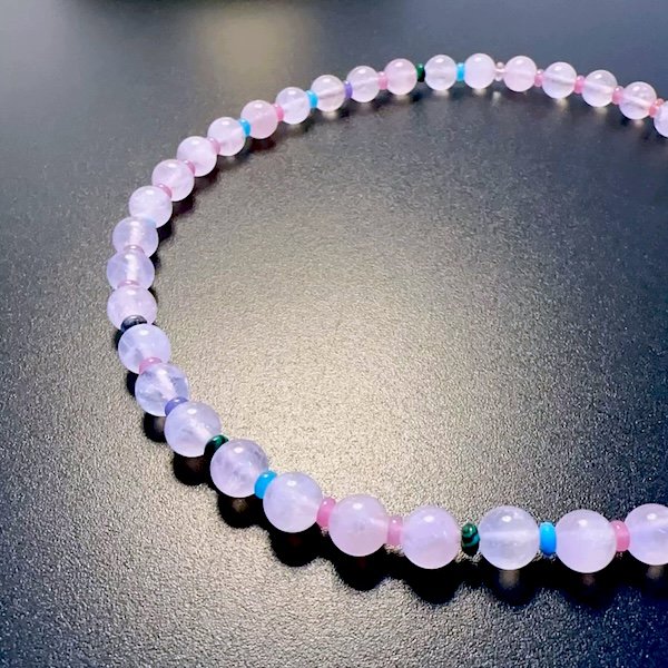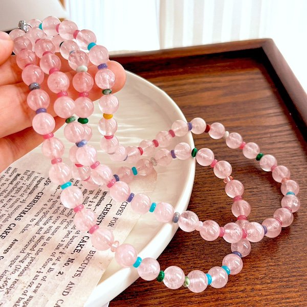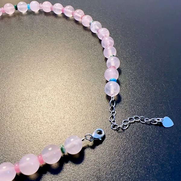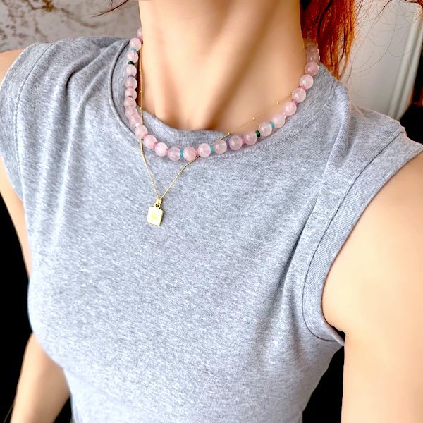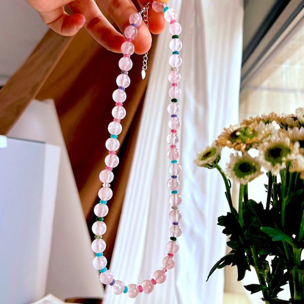 De ketting met rozenkwartskristal en dopamine-kralen is een vrolijk en levendig accessoire ontworpen om je geest te verheffen. Deze ketting is voorzien van echte rozenkwartskristallen kralen, bekend om hun krachtige zelfliefde en helende energie.