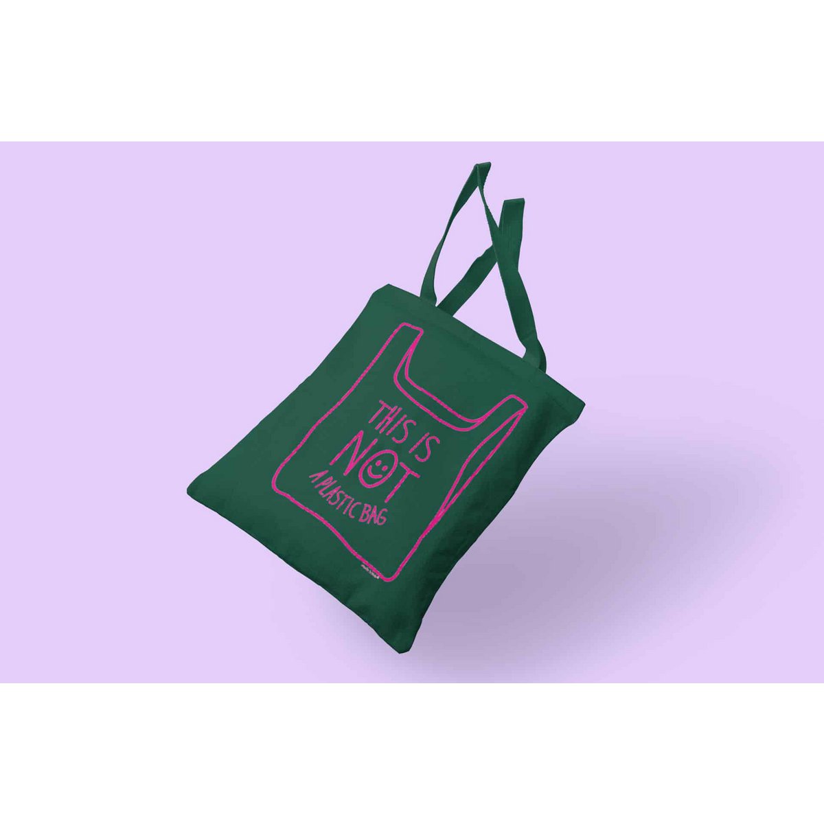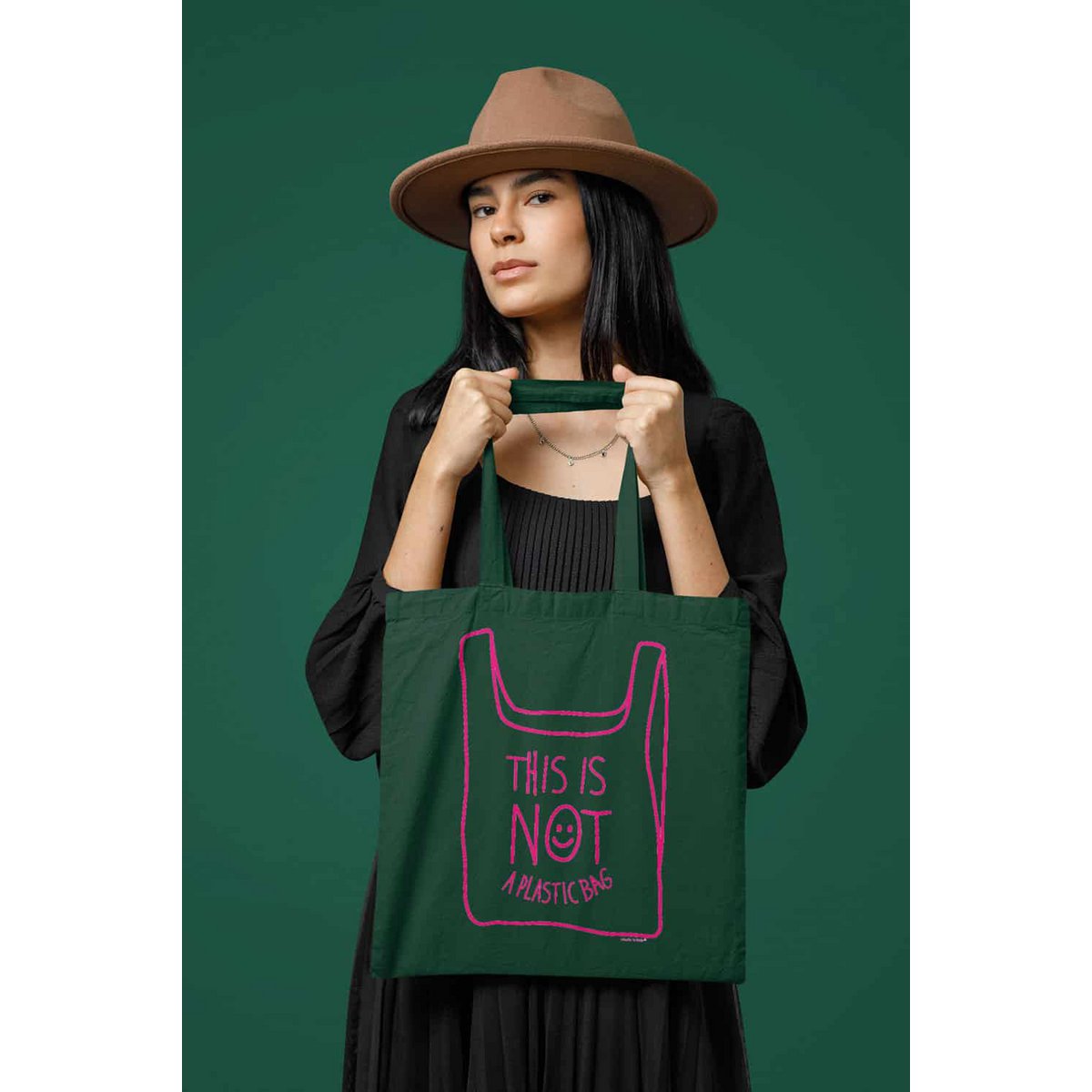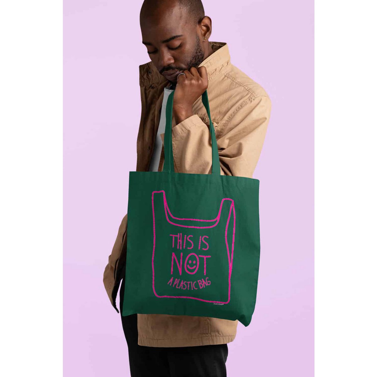 De afmetingen van de Tas This is not a plastic bag groen zijn 38 cm x 42 cm. De hengsels hebben een draaghoogte van 30 cm. Het gebruikte materiaal is 140 gr/m2 katoen. Daarmee geschikt voor verschillende doeleinden. De tas is groen met daarop een gezeefdrukte neon roze illustratie. De illustratie springt er extra uit door de kleur en omdat deze midden op de tas gezeefdrukt is. Tas wordt geproduceerd in de EU.