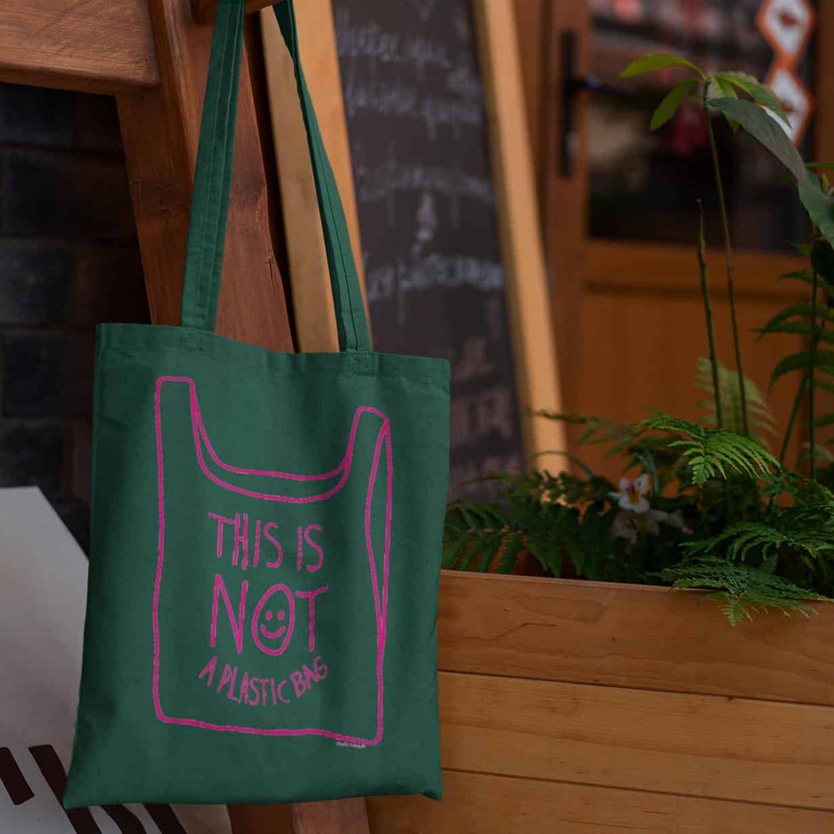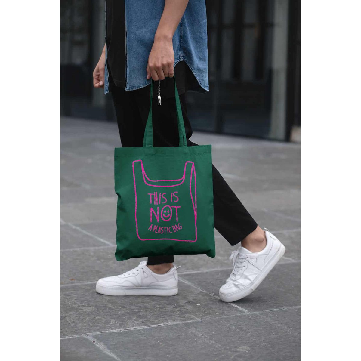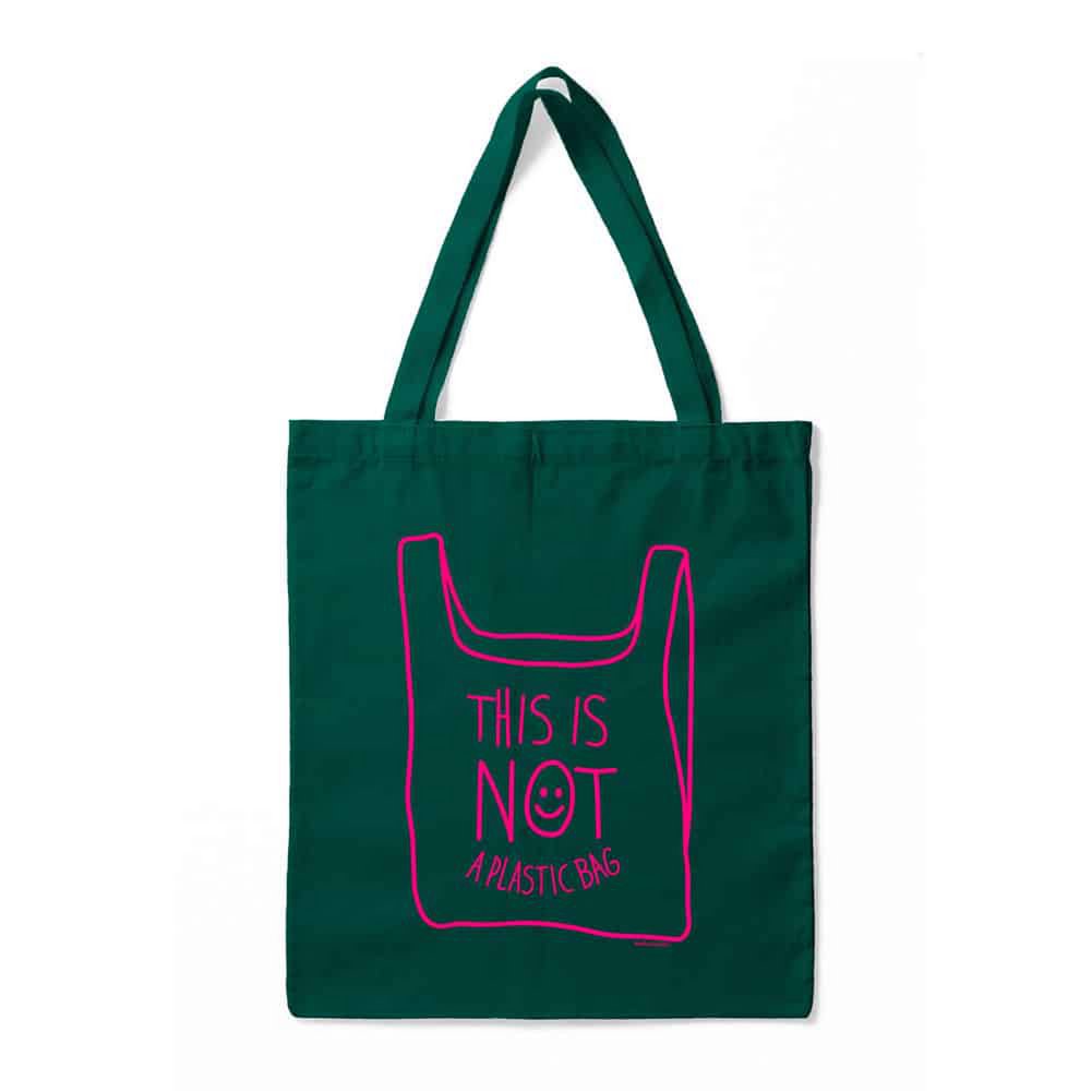 De afmetingen van de Tas This is not a plastic bag groen zijn 38 cm x 42 cm. De hengsels hebben een draaghoogte van 30 cm. Het gebruikte materiaal is 140 gr/m2 katoen. Daarmee geschikt voor verschillende doeleinden. De tas is groen met daarop een gezeefdrukte neon roze illustratie. De illustratie springt er extra uit door de kleur en omdat deze midden op de tas gezeefdrukt is. Tas wordt geproduceerd in de EU.